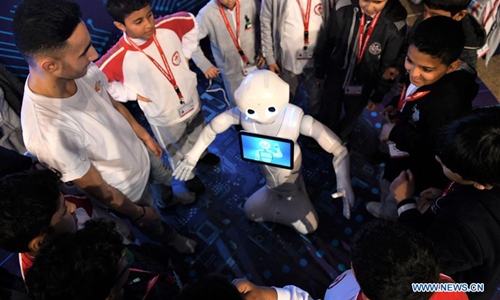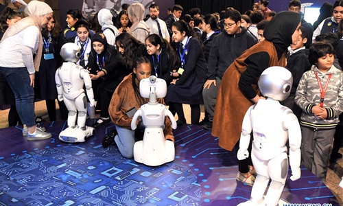 Children interact with robots at the Robotics and Artificial Intelligence (AI) Festival in Hawalli Governorate, Kuwait, on Feb. 9, 2020. Kuwait launched on Sunday the Robotics and Artificial Intelligence (AI) Festival to promote the scientific awareness in Kuwait. (Photo by Ghazy Qaffaf/Xinhua)