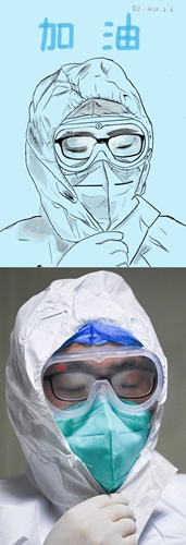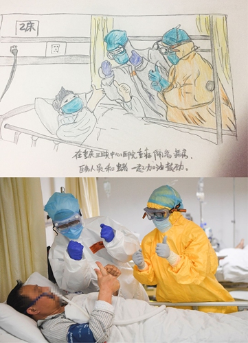 Medical workers cheer a patient up at an isolation ward at the Three Gorges Central Hospital in Chongqing, Feb. 1, 2020. (Xinhua/Wang Quanchao, Shiyan)