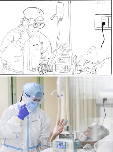 Huang Xia communicates with a patient at the intensive care unit in Three Gorges Central Hospital, Feb. 2, 2020. (Xinhua/Wang Quanchao, Dai Jing)