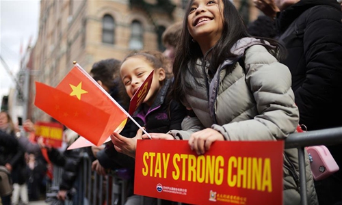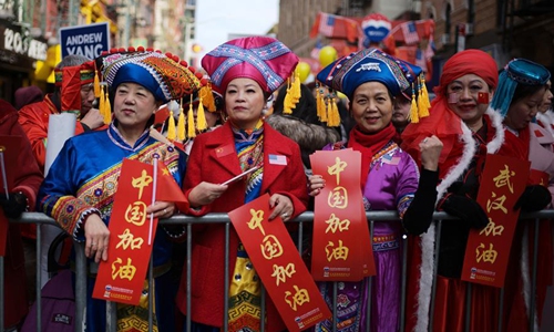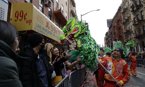 People attend the Chinese Lunar New Year parade in Manhattan's Chinatown of New York City, the United States, Feb. 9, 2020. (Xinhua/Li Muzi)