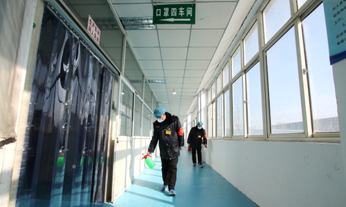 Volunteers who are also members of the Communist Party of China spray disinfectant on mask production companies on Monday in an industrial park in Handan, North China's Hebei Province, to help local companies resume work while preventing the virus spreading amid the outbreak. Photo: cnsphoto