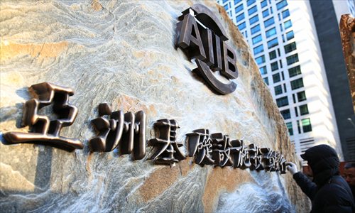 File photo: A worker cleans the sign in front of the Asian Infrastructure Investment Bank (AIIB) building in Beijing. Photo: CFP