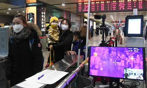 Passengers' body temperatures are checked at the exit of Beijing West Railway Station in Beijing, capital of China, Feb. 2, 2020. Chinese authorities have tightened measures to battle the novel coronavirus epidemic as a growing number of people hit the road and return to work after the Spring Festival holiday. Photo: Ren Chao/Xinhua
