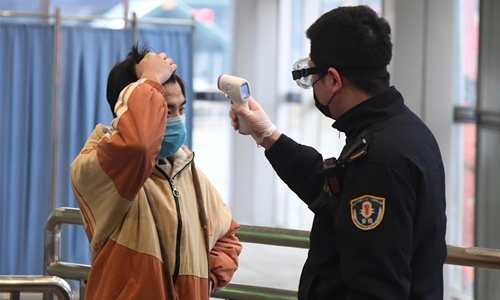 A staff member measures temperature for a passenger at Beijing West Railway Station in Beijing, capital of China, Feb. 2, 2020. Chinese authorities have tightened measures to battle the novel coronavirus epidemic as a growing number of people hit the road and return to work after the Spring Festival holiday. Photo: Ren Chao/Xinhua