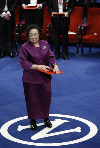 This file photo shows 2015's Nobel laureate in Physiology or Medicine Tu Youyou stands on stage during the Nobel Prize award ceremony at the Concert Hall in Stockholm, capital of Sweden, Dec. 10, 2015. (Xinhua/Ye Pingfan)