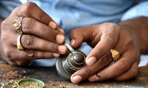 An artisan shows a handcrafted necklace at Vakurta in Savar on the outskirts of Dhaka, Bangladesh on Feb. 10, 2020. Vakurta in Savar is a place highly regarded for its exquisite jewelry and ornaments made by local artisans using methods passed on from one generation to the next. The rural village, which lies 30 minutes' ride away from Dhaka, is Bangladesh's nucleus of traditional jewelry artisans and craftsmen. (Str/Xinhua)
