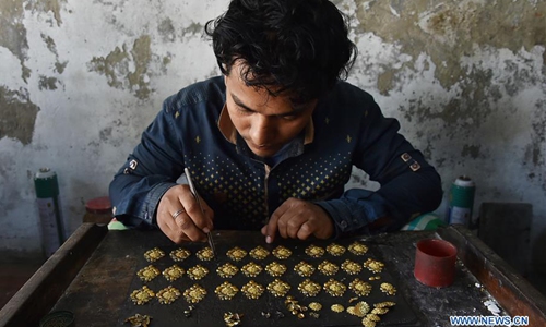An artisan makes components of a necklace at his workshop at Vakurta in Savar on the outskirts of Dhaka, Bangladesh on Feb. 10, 2020. Vakurta in Savar is a place highly regarded for its exquisite jewelry and ornaments made by local artisans using methods passed on from one generation to the next. The rural village, which lies 30 minutes' ride away from Dhaka, is Bangladesh's nucleus of traditional jewelry artisans and craftsmen. (Str/Xinhua)