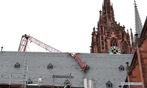 Photo taken on Feb. 10, 2020 shows the damaged roof of the cathedral in Frankfurt, Germany. The cathedral in Frankfurt was damaged when the jib of a building crane torn down by hurricane-force winds buckled and crashed into the roof of the cathedral. Storm Ciara, known as Storm Sabine in Germany, swept over Germany and caused severe disruptions to road, rail and air traffic over the past two days. (Xinhua/Lu Yang)