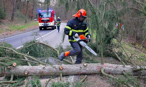 Firefighters clean up a trunk blown down by storm in Iserlohn, Germany, Feb. 10, 2020. Storm Ciara, known as Storm Sabine in Germany, hit the country's northwest on Sunday and continued to move south. Forecasters said it is expected to bring winds of up to 120 kilometers per hour. (Photo by Joachim Bywaletz/Xinhua)