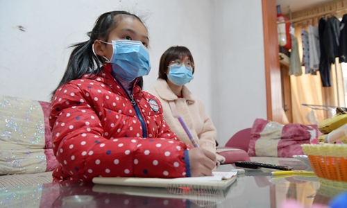 Gao Yingyan(L), a student of No.4 Primary School in Wanli District, attends an online class at home in Nanchang City, east China's Jiangxi Province, Feb. 10, 2020. (Xinhua/Peng Zhaozhi)