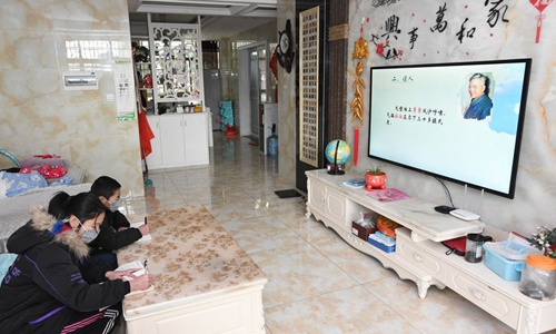 Twin brother and sister Hu Jintao and Hu Jinyan, study on network TV at home in Wojiang Village, Yuanzhou District of Yichun City, east China's c Province, Feb. 10, 2020. (Photo by Liu Jigang/Xinhua)