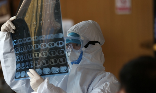A doctor checks the chest X-ray of a patient suspected of having novel coronavirus on Monday at an isolation station of a residential community in Hongshan district in Wuhan, the epicenter of the novel coronavirus outbreak. Photo: Cui Meng/GT
