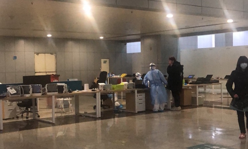 A doctor is checking patients at a Fang Cang Hospital in Wuhan International Conference & Exhibition Center in Jianghan district, Wuhan, Hubei Province Photo: Courtesy of Li Tian
