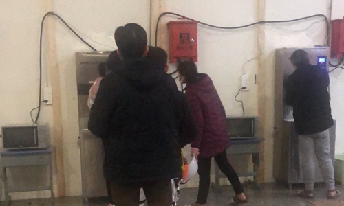 Patients queue up for filling bottles with boiled water in the Fang Cang hospital at Wuhan International Conference & Exhibition Center in Jianghan district, Wuhan, Hubei Province. Photo: Courtesy of Li Tian