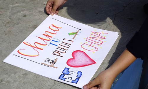 Photo taken on Feb. 7, 2020 shows a painting with words of encouragement to China painted by 13-year-old Valeria Castellano and her 11-year-old little brother Javier Castellano, in San Salvador, El Salvador. (Photo by Alexander Pena/Xinhua)