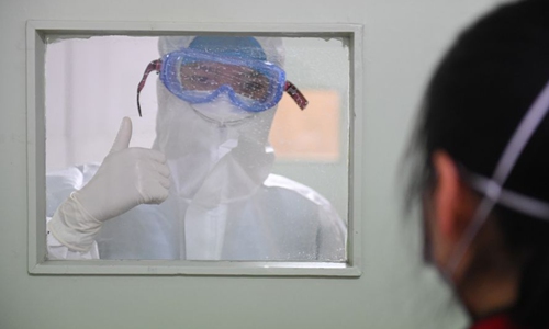 Yi Junfeng (L) gives a supportive thumb-up to a quarantined patient at a fever clinic of Hunan People's Hospital in Changsha, central China's Hunan Province, Feb. 7, 2020. (Xinhua/Chen Zeguo)