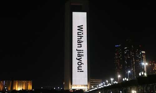 The building of Abu Dhabi National Oil Company (ADNOC) is illuminated with slogans in Chinese phonetic alphabets meaning "Wuhan, come on" in Abu Dhabi, the United Arab Emirates (UAE), Feb. 2, 2020, to cheer China up in the fight against the novel coronavirus. (WAM/Handout via Xinhua)