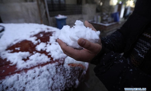 A man holds some snow in hand in Baghdad, Iraq, Feb. 11, 2020. Many people in the Iraqi capital of Baghdad woke up early on Tuesday to watch a rare snowfall in the city. Snow in Iraq is commonly seen in the northern part of the country, particularly in the mountainous areas. For most citizens in Baghdad, it is rare for them to see snow. Baghdad witnessed snowfall in January 2008 for the first time in over 100 years. (Xinhua/Khalil Dawood)