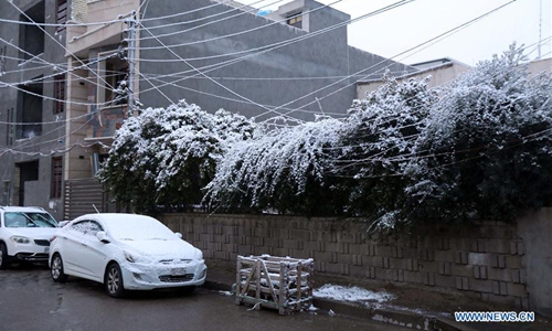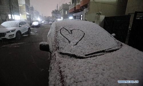Photo taken on Feb. 11, 2020 shows the snow in Baghdad, Iraq. Many people in the Iraqi capital of Baghdad woke up early on Tuesday to watch a rare snowfall in the city. Snow in Iraq is commonly seen in the northern part of the country, particularly in the mountainous areas. For most citizens in Baghdad, it is rare for them to see snow. Baghdad witnessed snowfall in January 2008 for the first time in over 100 years. (Xinhua/Khalil Dawood)