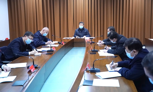 Chinese President Xi Jinping presides over a meeting and listens to report on the epidemic prevention and control work of Beijing at the center for disease control and prevention of Chaoyang District in Beijing, capital of China, on Feb. 10, 2020. Xi on Monday inspected the novel coronavirus pneumonia prevention and control work in Beijing. (Xinhua/Ju Peng)