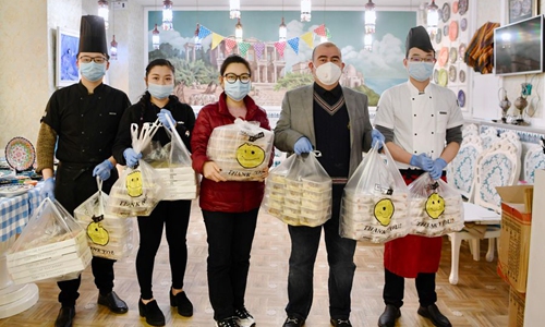 Turkish restaurant owner Alaaddin Colak (2nd, R) and his wife Mrs. Lin(C) displays free meals made for epidemic prevention workers to express their support and encouragement together with staff of their restaurant in Fuzhou, southeast China's Fujian Province, Feb. 9, 2020. (Xinhua/Jiang Kehong)