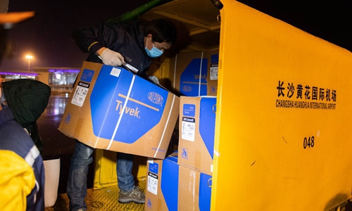 Staff carry boxes of protective medical suits at Changsha Huanghua International Airport in Changsha, central China's Hunan Province, Feb. 5, 2020. A freight plane carrying 42,000 advanced protective medical suits purchased in the United Arab Emirates arrived in Changsha, lessening the shortage of protective suits in the fight against novel coronavirus in Hunan. (Xinhua/Chen Sihan)
