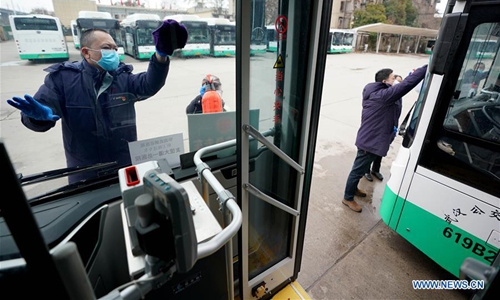 Bus drivers clean the bus in Wuhan, central China's Hubei Province, Feb. 11, 2020. After Wuhan suspended public transportation, the Wuhan Bus deployed buses to commute medical staff and people working at necessary sectors. (Xinhua/Wang Yuguo)