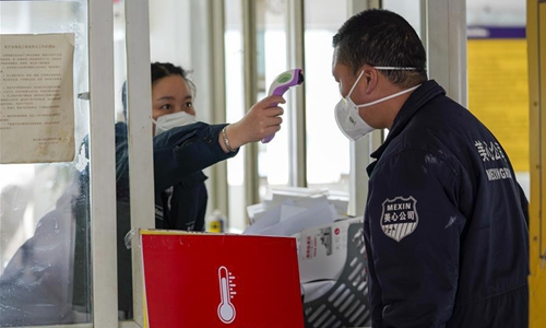 An employee takes temperature checking at a staff domitory of Chongqing Mexin Group in southwest China's Chongqing Municipality, Feb. 12, 2020. The municipality government is cooperating with local companies to strengthen the epidemic prevention and control before the resumption of production. (Xinhua/Liu Chan)