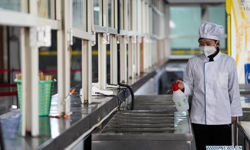 An employee disinfects the kitchen of a dining area of Chongqing Mexin Group in southwest China's Chongqing Municipality, Feb. 12, 2020. The municipality government is cooperating with local companies to strengthen the epidemic prevention and control before the resumption of production. (Xinhua/Liu Chan)