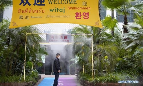 An emloyee walks through a disinfection gate before leaving the working area at Chongqing Mexin Group in southwest China's Chongqing Municipality, Feb. 12, 2020. The municipality government is cooperating with local companies to strengthen the epidemic prevention and control before the resumption of production. (Xinhua/Liu Chan)