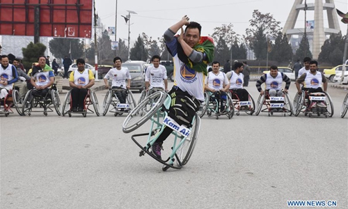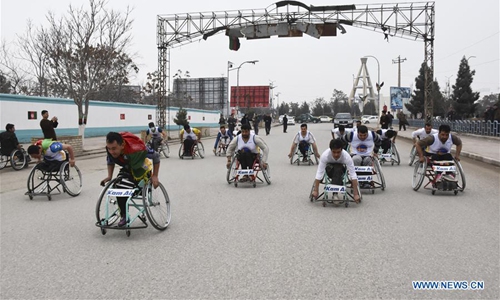 Participants compete during a wheelchair racing in Mazar-i-Sharif, capital of Balkh province, Afghanistan, Feb. 12, 2020. About 30 participants took part in the wheelchair racing held on Wednesday. (Photo by Kawa Bahsarat/Xinhua)