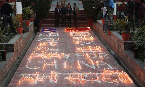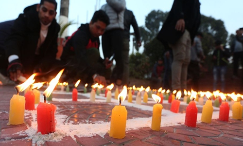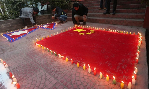 Nepali people participate in a candlelight vigil in support for China's fight against the novel coronavirus during an event organized in Kathmandu, Nepal, Feb. 12, 2020. (Xinhua/Sunil Sharma)