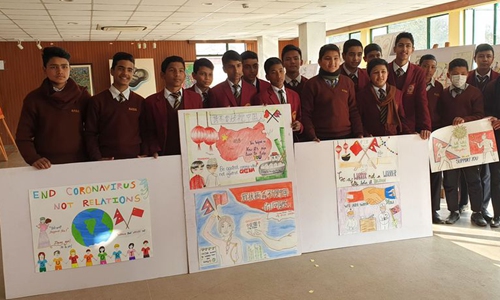 Students present their creation during an event organized in support for China's fight against novel coronavirus in Kathmandu, Nepal, Feb. 12, 2020. (Xinhua/Sunil Sharma)