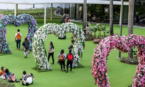 People walk under heart-shaped flower arches for Valentine's Day at a mall in Quezon City, the Philippines, Feb. 11, 2020. (Xinhua/Rouelle Umali)