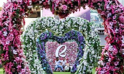 A couple pose for a photo under heart-shaped flower arches for Valentine's Day at a mall in Quezon City, the Philippines, Feb. 11, 2020. (Xinhua/Rouelle Umali)