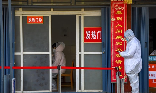 A patient with fever (L), who called the hotline "96120" for help, receives medical checks at Wolongxiang pulic health clinic at Xiaonan District of Xiaogan, central China's Hubei Province, on Feb. 9, 2020. In a bid to curb the spread of the novel coronavirus, Xiaogan city in Hubei has set up a 24-hour hotline platform "96120" to listen to citizens' needs and help them get out of difficulties as quickly as possible. (Xinhua/Hu Huhu)