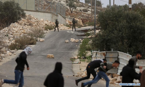 Israeli soldiers aim their weapons at Palestinian protesters during clashes with Israeli soldiers after a protest against the expanding of Jewish settlements in Kufr Qadoom Village near the West Bank city of Nablus, Dec. 13, 2019. (Photo by Ayman Nobani/Xinhua)