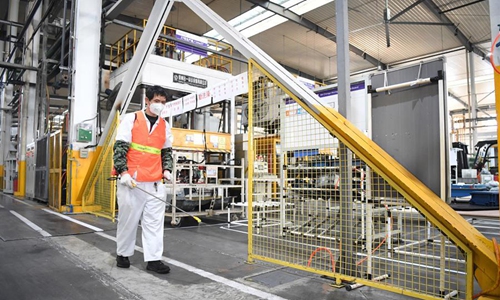 A worker disinfects the workshop in Faurecia (Chongqing) Automotive Parts Co., Ltd, a Sino-French joint venture, in Chongqing Airport Development Area in southwest China's Chongqing Municipality, Feb. 12, 2020. Under the guidance of concerning authorities, the company resumed production recently with comprehensive epidemic prevention measures. (Xinhua/Tang Yi)