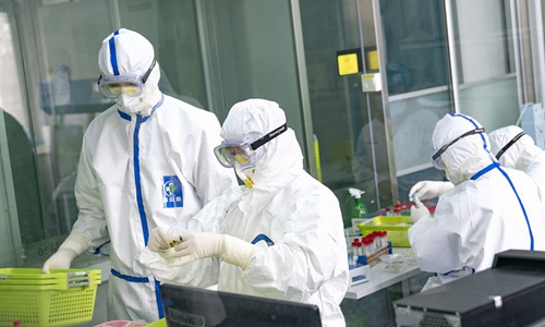 Staff members work in a laboratory in Wuhan, central China's Hubei Province, Feb. 13, 2020. (Xinhua/Xiong Qi)