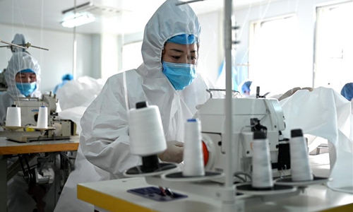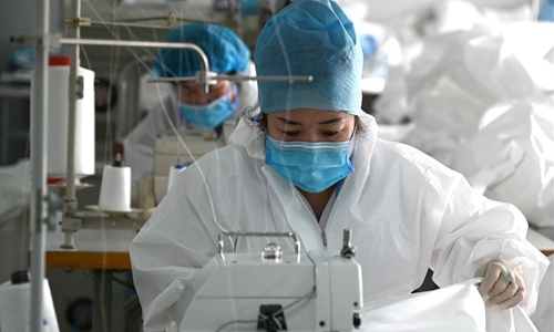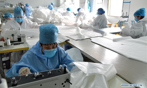 Workers make protective suits at a factory of a medical instrument company in Hohhot, capital of north China's Inner Mongolia Autonomous Region, Feb.14, 2020. The company that can produce about 400 protective suits per day has resumed production since Jan 24 to ensure the supply of protective suits during the fight against the novel coronavirus epidemic. Photo:Xinhua