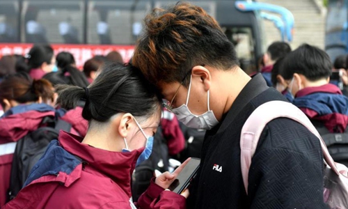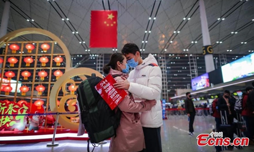 A doctor says goodbye to her boyfriend before leaving for Hubei province in North China’s Tianjin municipality. Photo:China News Service