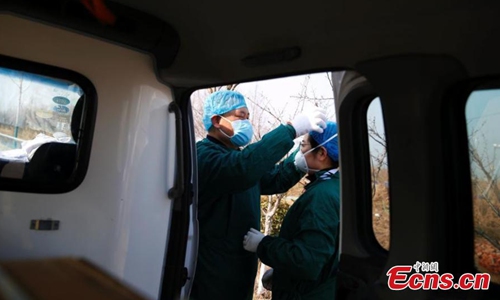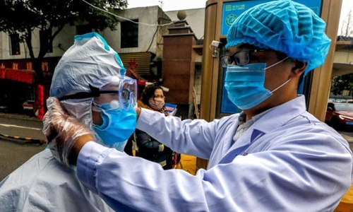 A couple both of whom are doctors help each other to adjust goggles in Lujiang county under Hefei city,East China’s Anhui province. Photo: China News Service
