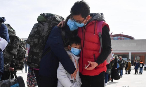 A doctor hugs with her husband and 5-year-old daughter before leaving for Hubei province in Kunming, capital city of Southwest China's Yunnan province. Photo: China News Service