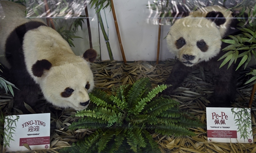 Two anatomized giant pandas Ying Ying and Pe-Pe, which were donated by the government of China, are displayed at the Chapultepec Zoo in Mexico City, on Wednesday. Photo: AFP