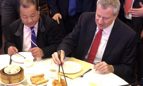 Bill de Blasio (R), mayor of New York City, eats Chinese food at a Chinese restaurant in New York, the United States, on Feb. 13, 2020. (Photo by Zhang Fan/Xinhua)