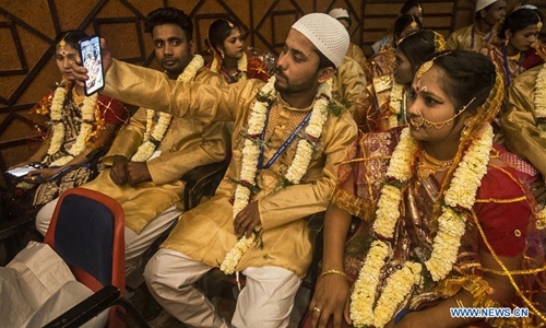A couple takes a selfie as they participate in a mass wedding on the occasion of the Valentine's Day in Kolkata, India, Feb. 14, 2020. (Xinhua/Tumpa Mondal)