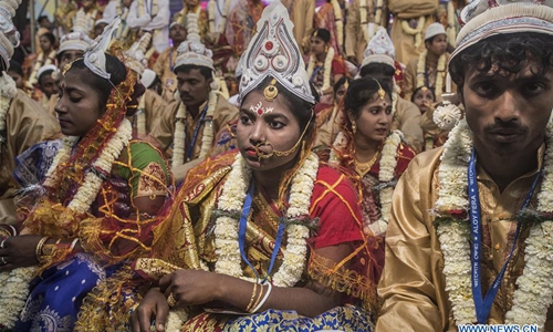 Brides and grooms participate in a mass wedding on the occasion of the Valentine's Day in Kolkata, India, Feb. 14, 2020. (Xinhua/Tumpa Mondal)