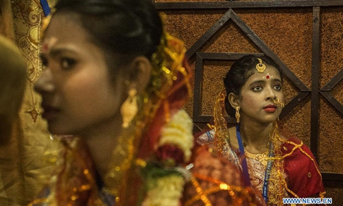 Brides are seen as they participate in a mass wedding on the occasion of the Valentine's Day in Kolkata, India, Feb. 14, 2020. (Xinhua/Tumpa Mondal)