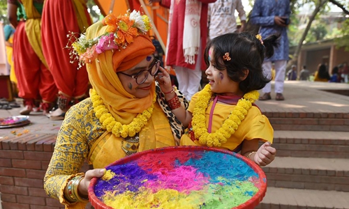 Girls pose for pictures during the Pahela Falgun festival in Dhaka, Bangladesh, Feb. 14, 2020. (Str/Xinhua)