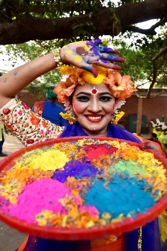 A young woman poses for picture with a tray of colored powder on her hand during the Pahela Falgun festival in Dhaka, Bangladesh, Feb. 14, 2020. (Str/Xinhua)